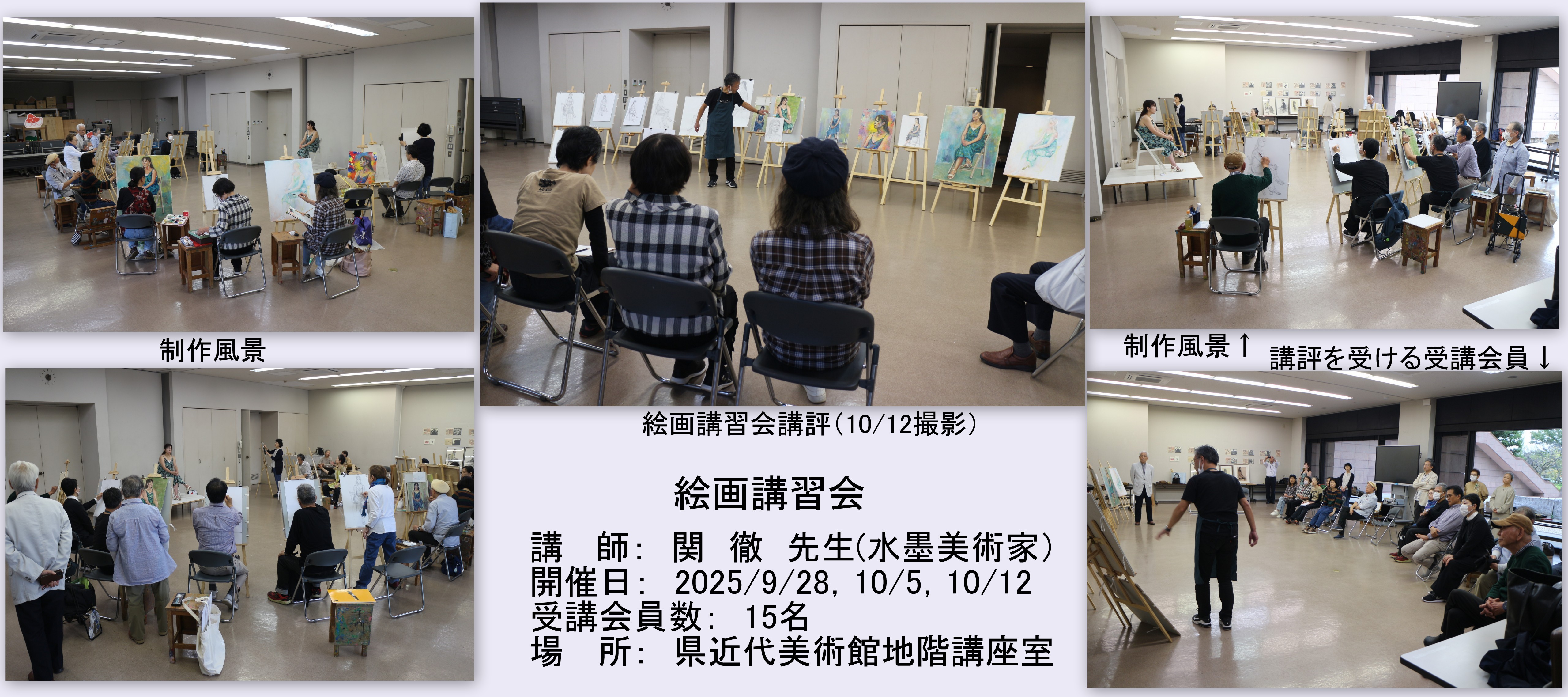 2025年9月28、10月5、12日の3日間、講師 関 徹 先生(水墨美術家)による絵画講習会を開催しました。15名が参加。女性モデルの人物画を鉛筆、木炭デッサン、水彩、油彩等受講者の好みで各自傑作を制作しました。最終日に、先生の講評があり、充実した初秋の3日間を過ごしました。